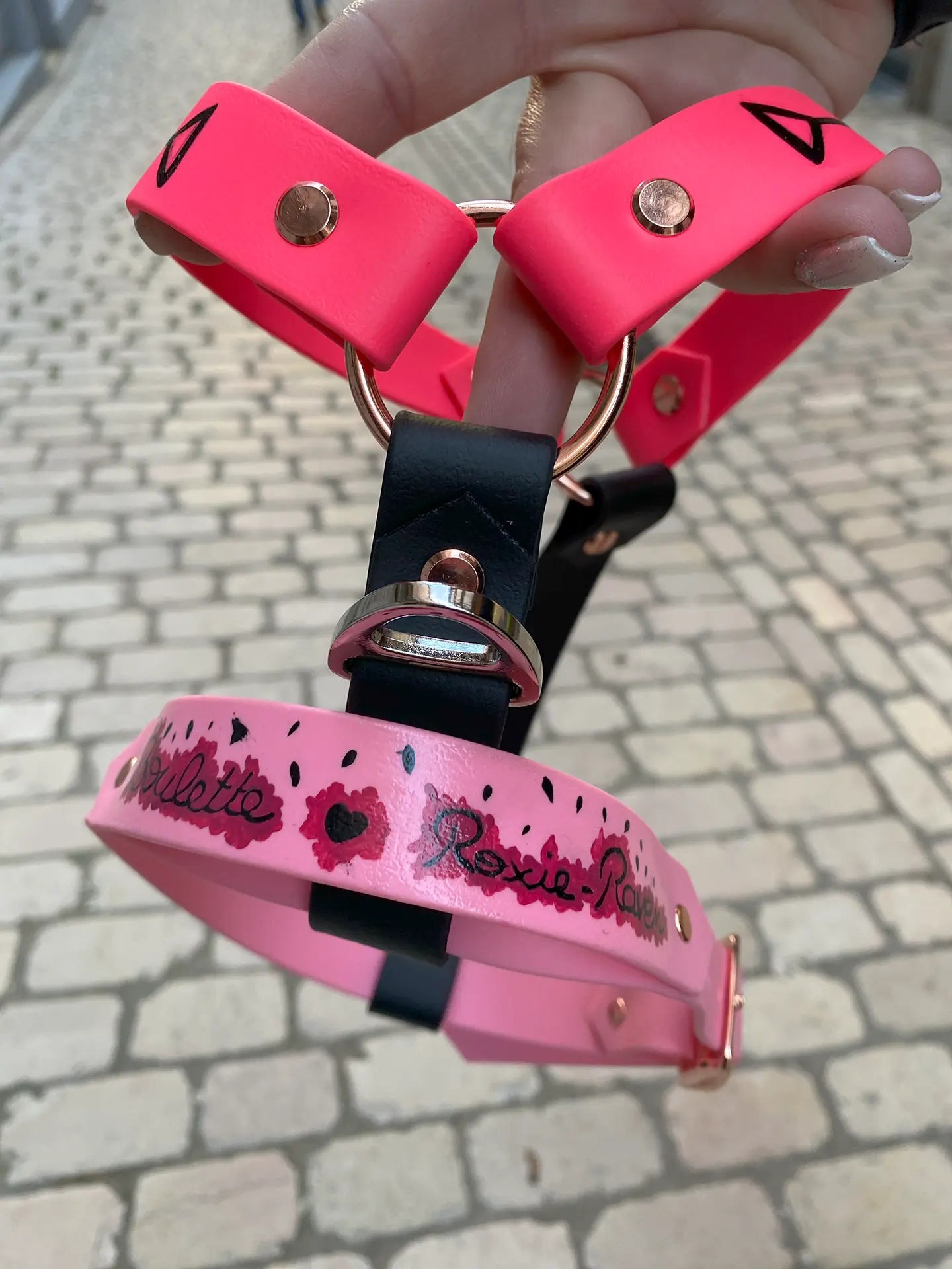 - Personnalisation créative : ajoutez un symbole et / ou le nom de votre chien en peinture acrylique ou en gravure pour un harnais unique, fait sur mesure.